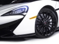 The exterior of the McLaren 570GT concept receives an Elite Pearl White paint job. A deep gloss black paint has been used to highlight the wheels, side skirt, door inserts, front, and rear-end of the supercar. The interior receives premium saddle tan leather upholstery with carbon fibre inserts.