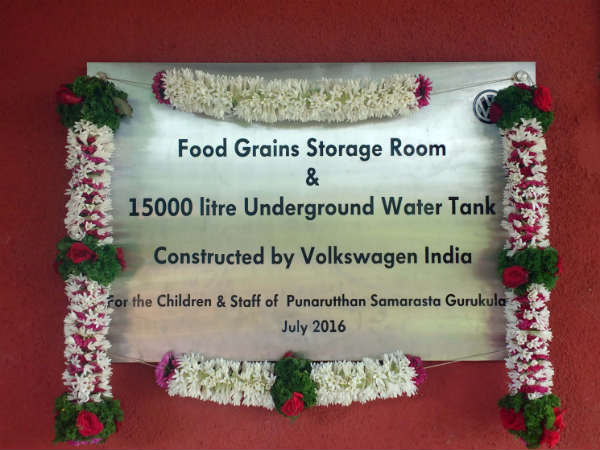 Volkswagen India has undertaken and completed the project of constructing water and food grain storage facilities at the premises of Punarutthan Samarasta Gurukulam.
