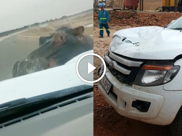 A man driving his pickup truck home back to South Africa got the worst shock of his life when an enraged hippo smashed into the front of his Ford pickup truck