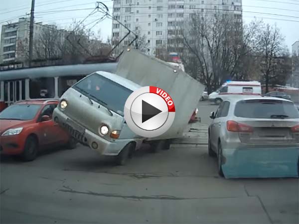 Case in point, the driver of the ligh goods vehicle who crossed the tram lines (atleast he though he had) and parked it while waiting for the lights to change(atleast that's what we think he was doing). The incoming tram slams into him and deposits his small truck on top of another vehicle.