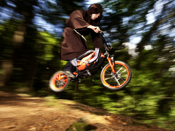 The Bergmoench bike is for the hard core mountain hiking enthusiast. It has been developed for a quick ride down hill and the rider needs to be on an upright position during the ride. You need to rely on the slope of the hill to get down. The bike has foot rests on which you need to stand while riding.